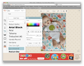 Now it's time for the words.  Click on the "Text" page (the icon with the letters, "Tt"...makes a little more sense than the butterfly, I suppose).  Choose your desired font (I used "Quicksand"), and click "Add Text".
